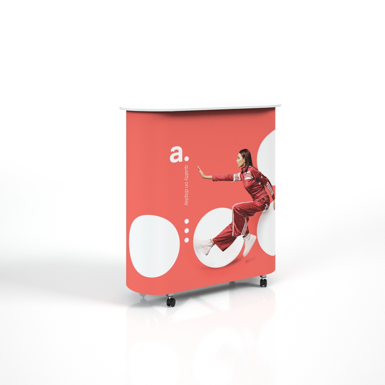 adTribune Elypse Mini to mini wersja mobilnej lady targowej, która łączy kompaktowy design z pełną funkcjonalnością. Dzięki konstrukcji na kółkach i wymiennym wydrukom jest idealnym narzędziem promocyjnym na różnorodne wydarzenia.