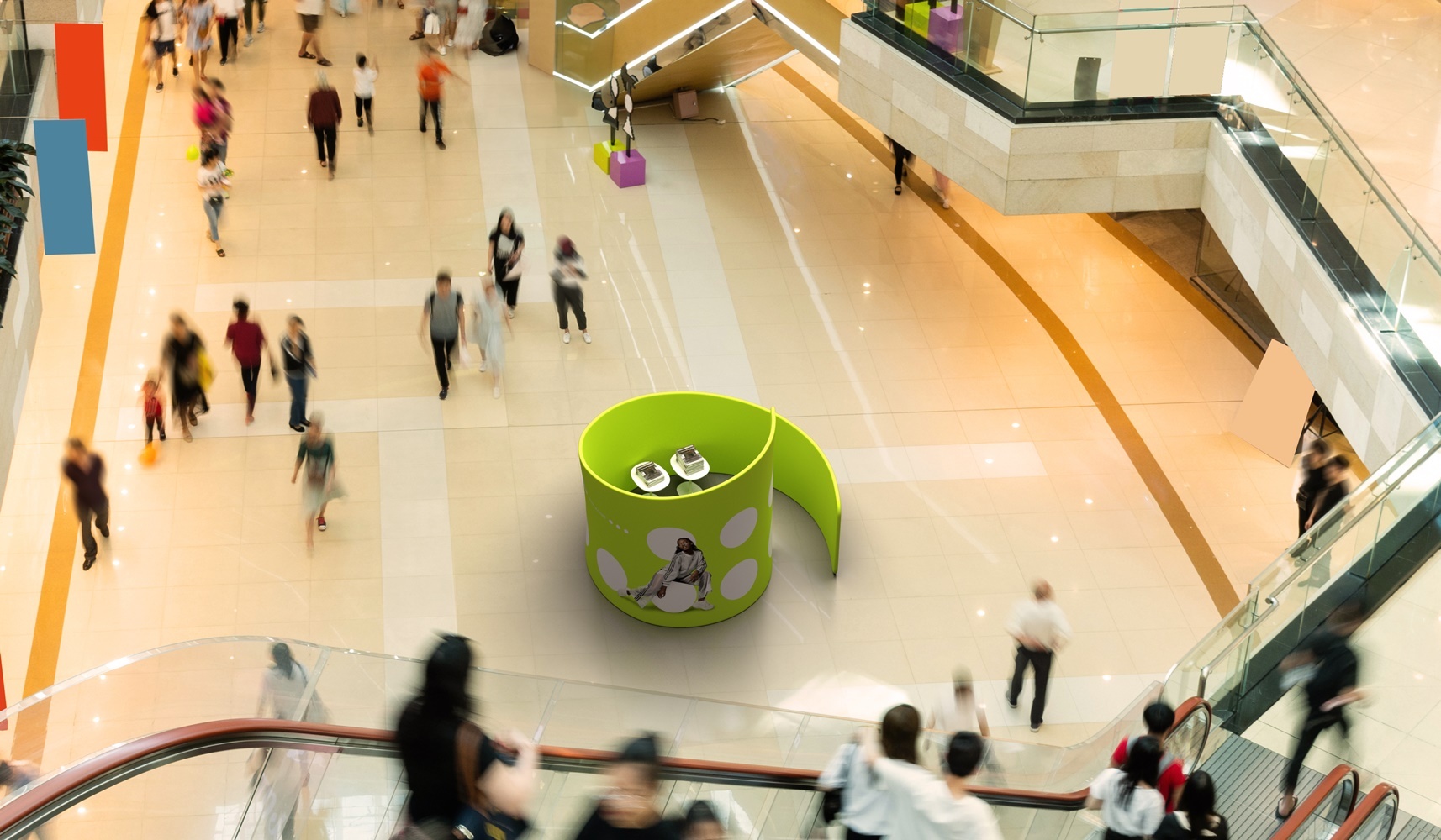 Promotion in Einkaufszentren: Dank seiner ungewöhnlichen Form zieht adWall Vario In effektiv die Aufmerksamkeit der Kunden auf sich und wird zum zentralen Punkt der Promotion im Einkaufszentrum.