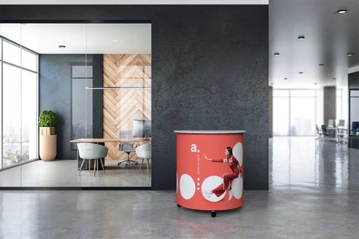 Azioni promozionali: Il montaggio senza attrezzi di adTribune Hit facilita linstallazione del tavolo ovunque, e la struttura su ruote consente di svolgere azioni promozionali dinamiche.