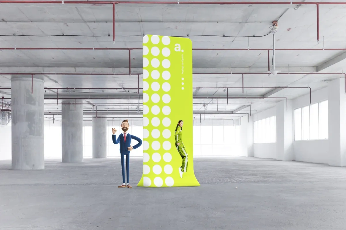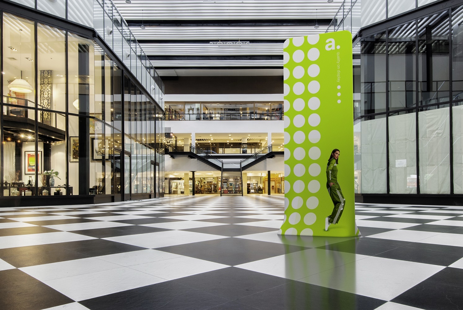 Promotions in shopping centers: the tall structure ensures excellent visibility of the advertisement in crowded places, attracting customers to your booth.