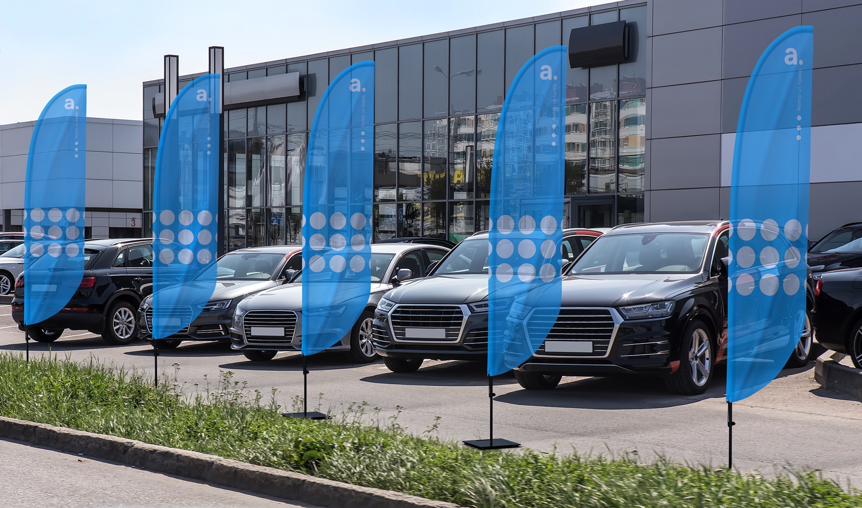 adFlag Standard è una bandiera pubblicitaria che puoi utilizzare per segnalare e promuovere il tuo evento. Sul tessuto stampato appariranno le tue grafiche personalizzate, che attireranno l'attenzione del pubblico e li attireranno al tuo stand. Il set presentato qui include la bandiera con il logo, una stampa tessile e un'asta.