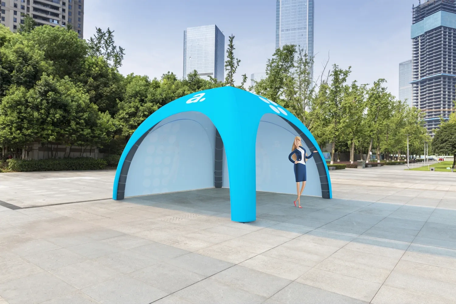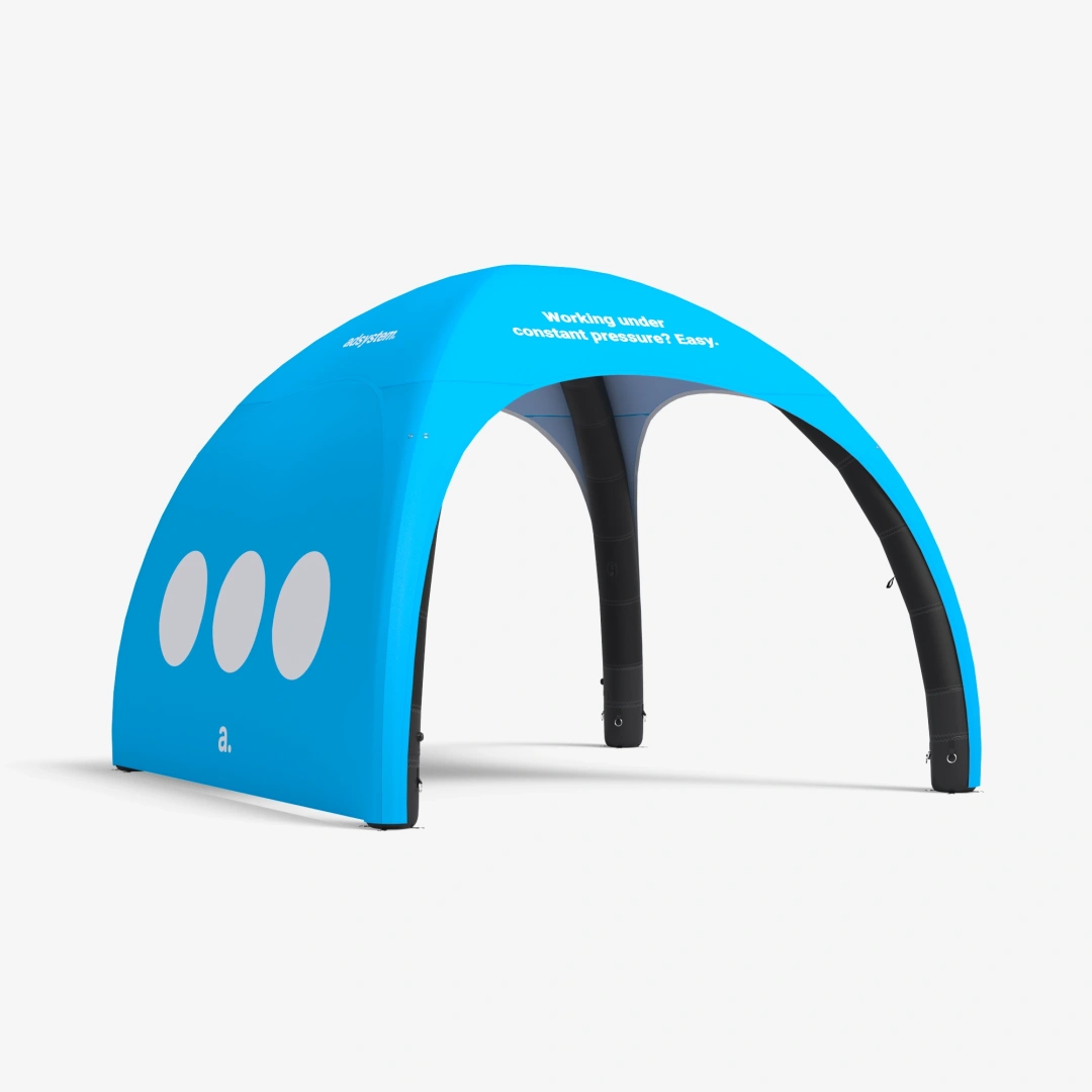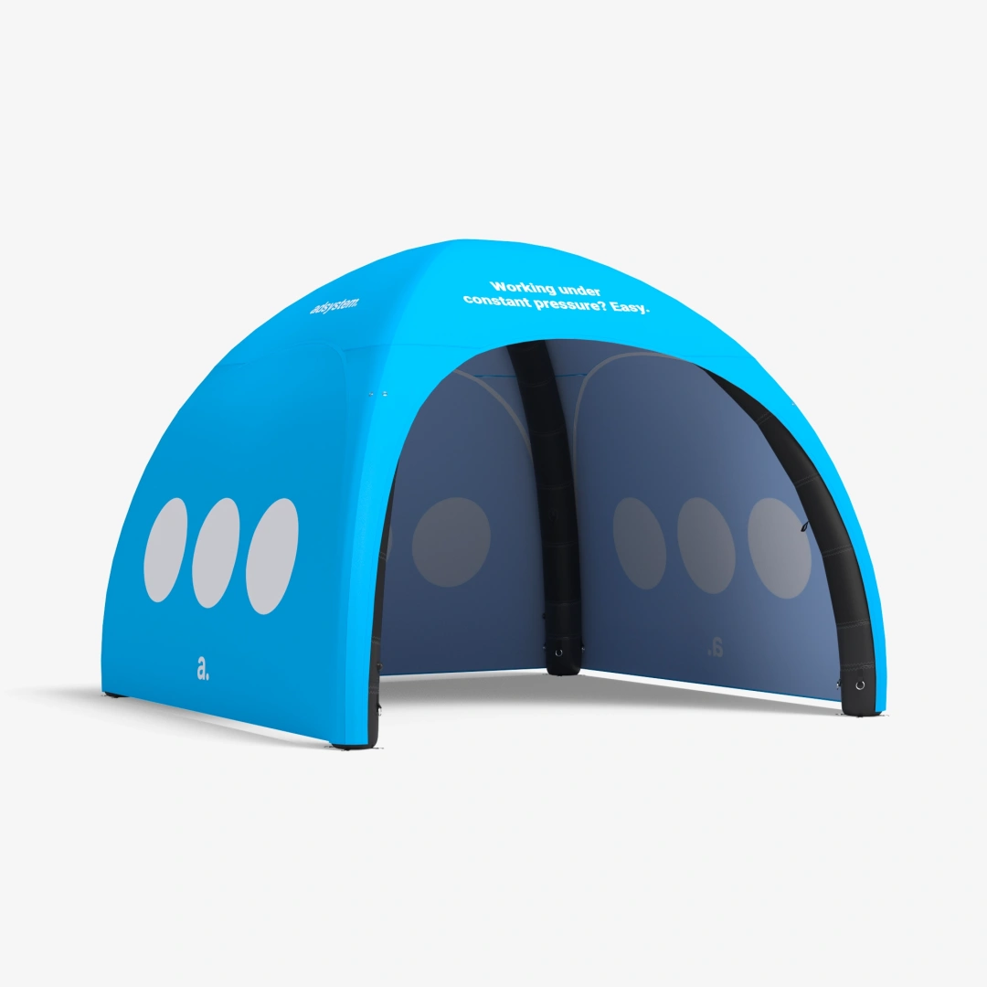 adTent Air Premium to namiot dmuchany imprezowy, który wykorzystasz nie tylko jako zabezpieczenie przed warunkami atmosferycznymi, ale również jako nośnik reklamy. Materiał pokrywający konstrukcję zadrukujemy twoimi firmowymi grafikami, dzięki czemu namiot reklamowy zwróci uwagę twoich odbiorców i przyciągnie ich do stoiska. Prezentowany tu namiot dmuchany opiera się na stałociśnieniowym stelażu, który utrzymuje niezmienny poziom powietrza dzięki specjalnym zaworom.