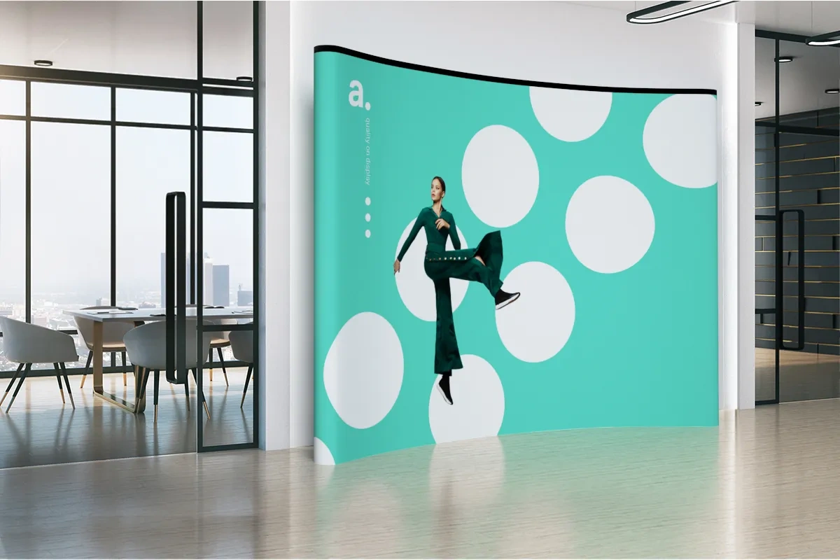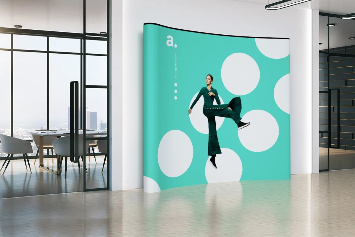 Bürodekoration: Die adWall Pop-Up Gebogen kann auch in den Firmenräumen eingesetzt werden. Sie können sie im Empfangsbereich aufstellen, um Gäste gleich beim Betreten zu begrüßen, oder im Konferenzraum, wo sie als Hintergrund für die sprechenden Mitarbeiter dient.