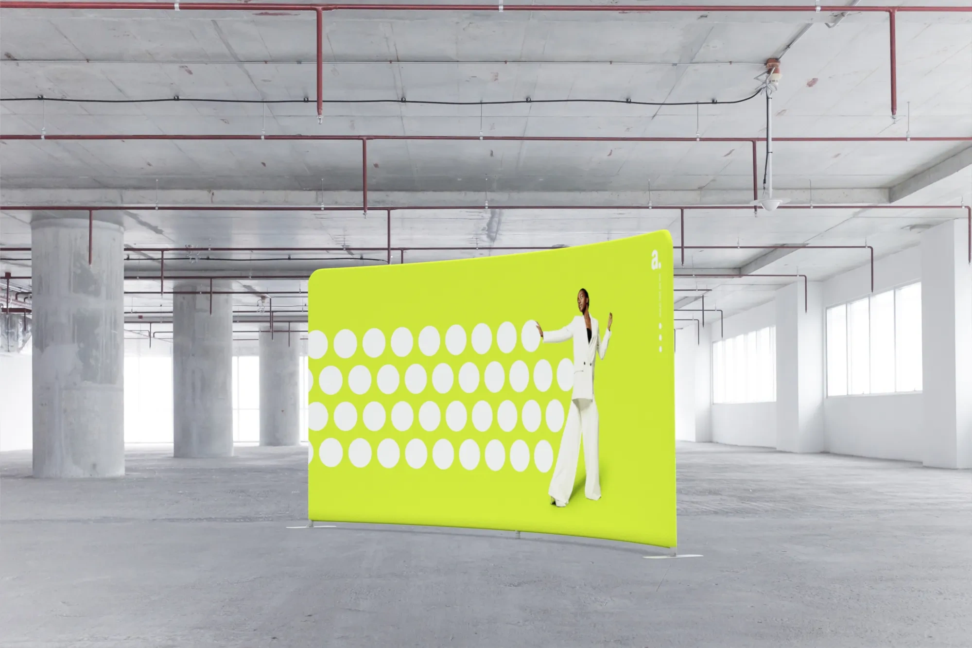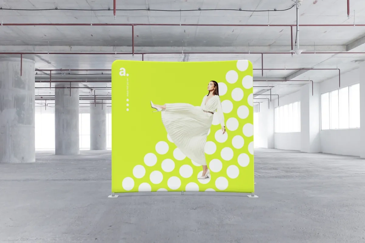 adWall Vario Gebogen Premium ist eine gebogene Messewand, die Ihre Werbemaßnahmen unterstützt. Sie können sie bei Werbeaktionen, Konferenzen oder Branchentreffen einsetzen. Für die Konstruktion haben wir Aluminiumprofile mit einer Breite von 43 mm verwendet, und den Druck mit Ihrer personalisierten Grafik fertigen wir auf Textilmaterial an.