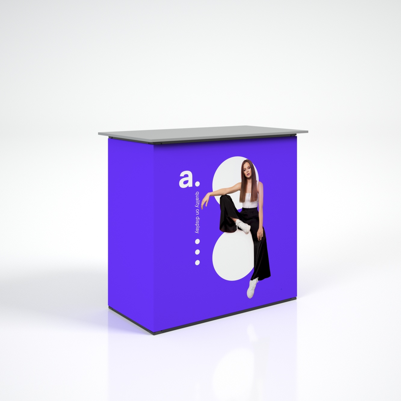 Die Multiframe Theke ist ein funktionales Element des Multiframe-Ausstellungssystems, das Ihren Messestand perfekt ergänzt und einen einheitlichen sowie professionellen Präsentationsbereich schafft. Sie bietet idealen Raum für Produktpräsentationen oder Kundengespräche.